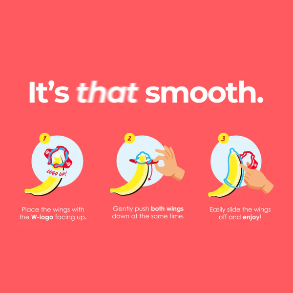Grib fat om “vingerne” på en Wingman, rul det ned over penis i et snuptag. Vip “vingerne” af og smid væk.